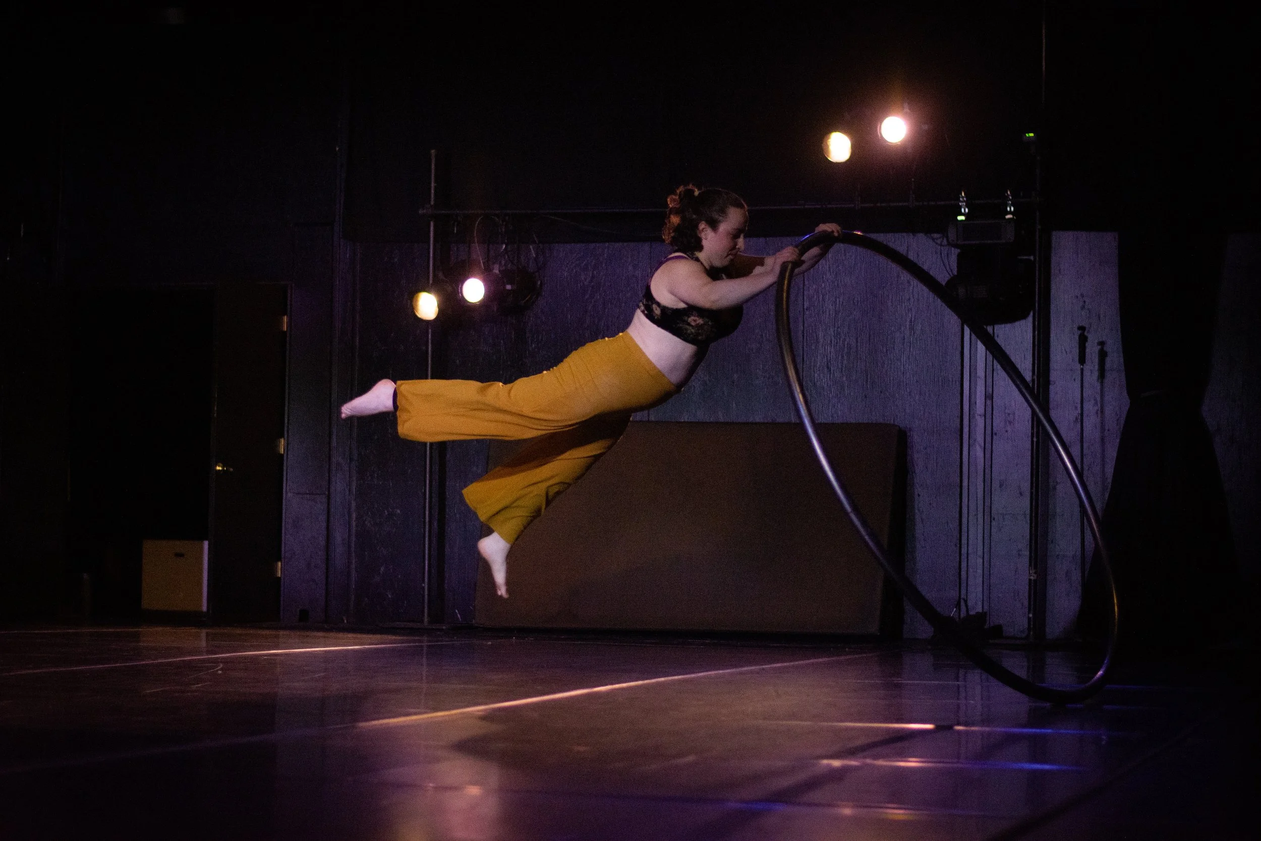 Two circles on a stage: a lyra and a Cyr wheel—similar in form, sharing the same space, yet moving separately.
